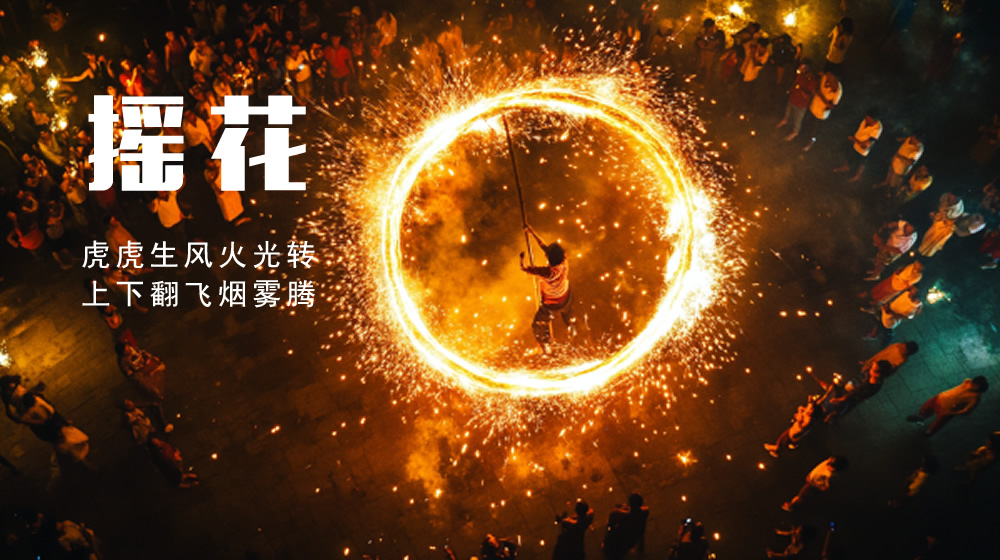 “摇花”是将木碳、盐、硝和铁屑按比例调合在一起装在铁丝编织的灯笼里,将点燃的灯笼系上长链栓在丈余高的大竹竿上端,竹杆下端插在地下挖的窝子里,由几个年轻人光着脊梁,轮换着用力转动竹竿,随着旋转速度的加快,吐着火舌的灯笼,犹如呼啸的火龙划过夜空,火龙由火红色逐渐变成了白炽色,只见其上下翻飞,呼呼生风,硝炭燃烧,金星迸溅,噼啪作响,将漆黑的夜空照的亮如白昼。速度再快点,铁索被甩成成水平状,迸发的火碳四处乱飞,围观人群生怕飞到自己身上,不由得往后撤了再撤,随着四周观众的呐喊声和鼓掌声,转动者越发卖力,轮番上阵,一个灯笼的硝炭烧完了再换上第二个灯笼,“摇花”人一直到汗流浃背,累得不能再玩了为止。伴随着火龙的呼啸声、硝炭燃烧的噼啪声以及观众们的呐喊声,场面蔚为壮观。
