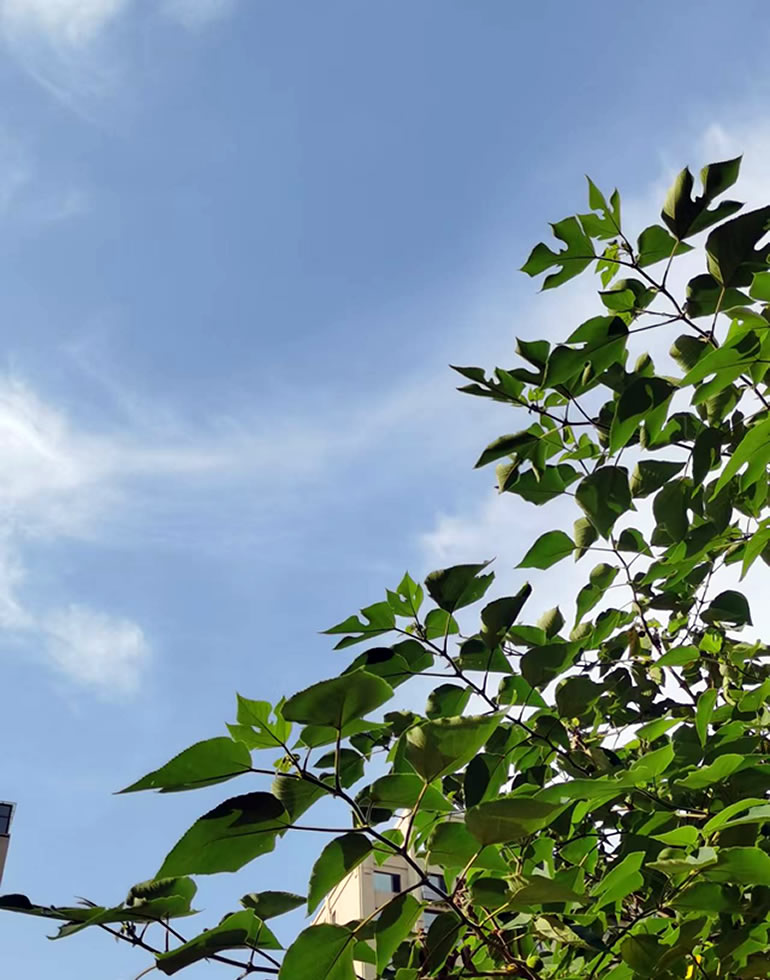 夕照晴空映碧叶,风摇翠影展新枝