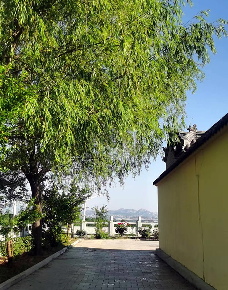 垂柳碧浓铺岸绿,群山巍峨映天蓝
